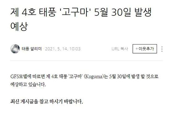 01호 태풍 두쥐안 Dujuan 02호 태풍 수리개 Surigae 03호 태풍 초이완 Choi-wan 04호 태풍 고구마 Koguma 05호 태풍 참피 Champi. 일본에서 고구마koguma는 별자리 중 작은 곰자리를 의미하는 단어라고 합니다. 필리핀 동쪽 해상에서 올해 다섯 번째 열대저압부 TD가 발생한 가운데 온라인상에서는 기상청보다 앞선 태풍 관련 예보가 올라와 혼란이 일고 있다.